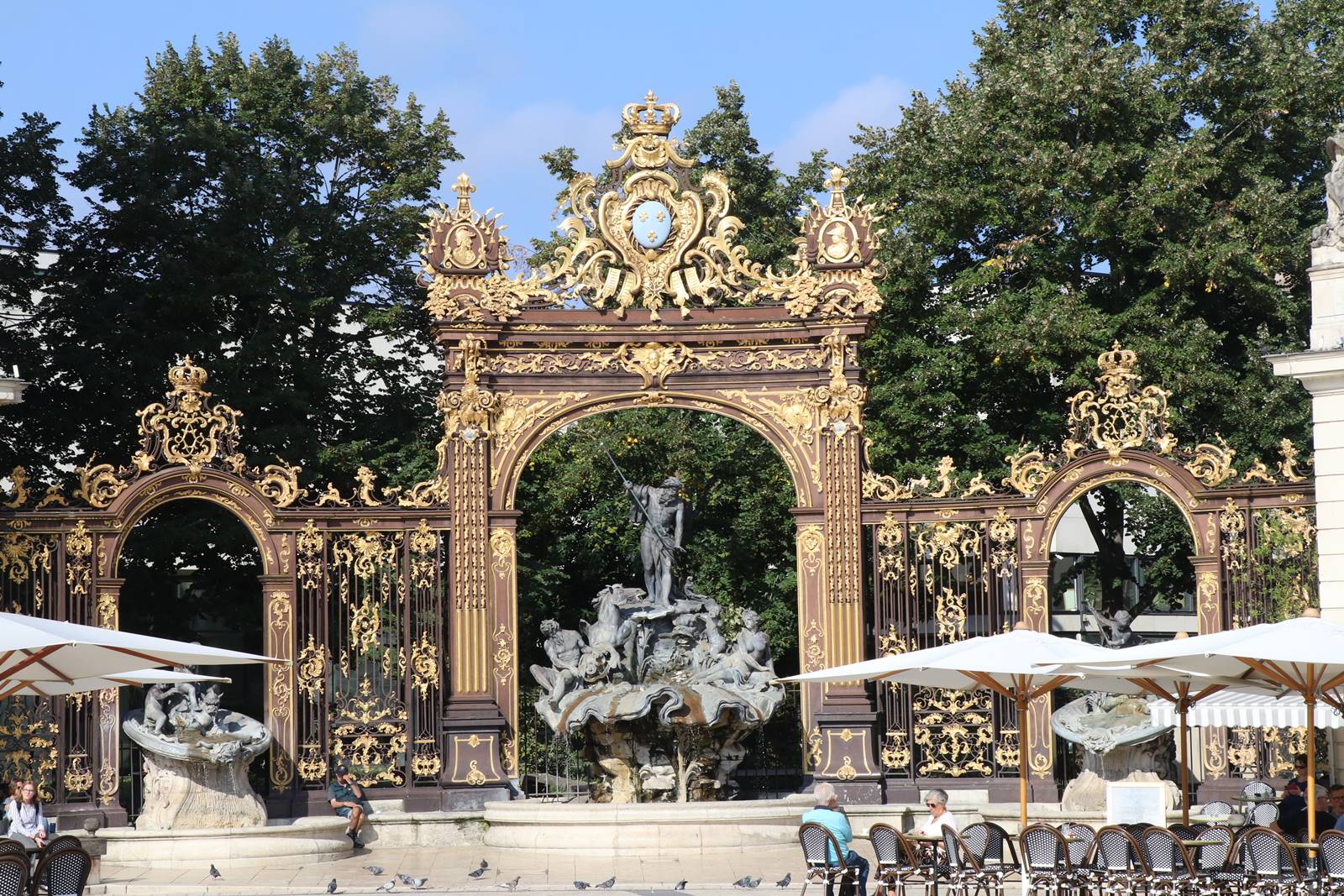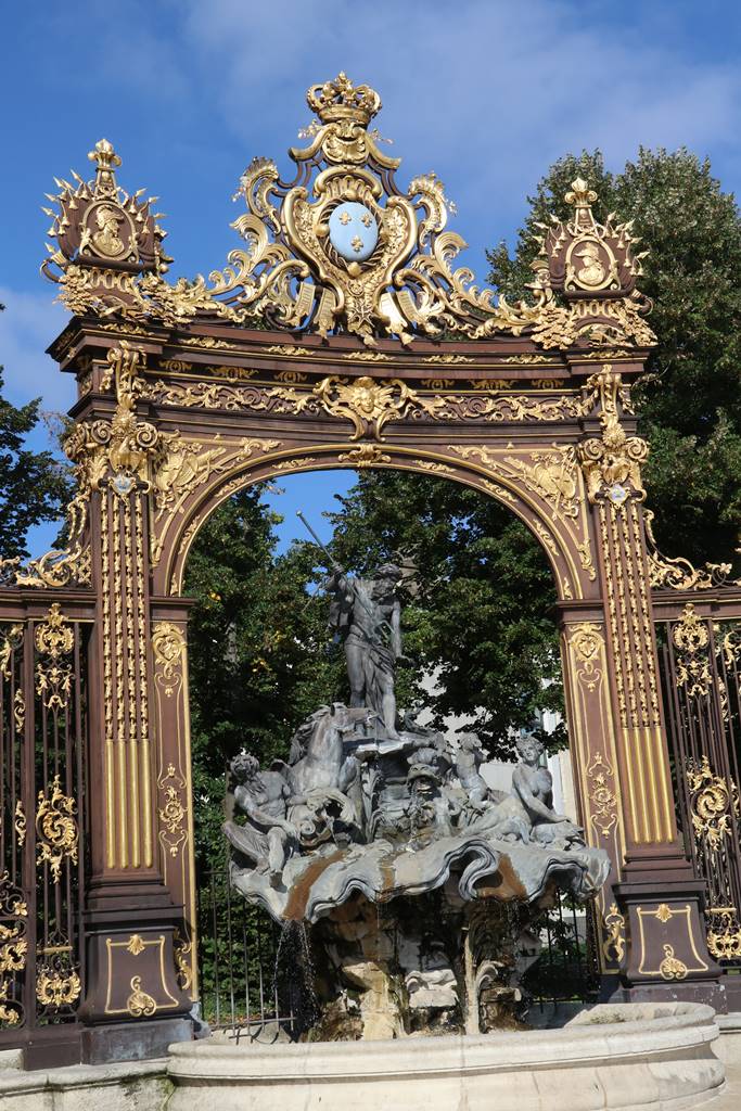 Six grilles monumentales de style rococo en fer forgé rehaussées de feuilles d’or valent à Nancy le surnom de Ville aux Portes d’Or. Les pilastres supportant la ferronnerie sont ornés de feuilles de chêne symbolisant la force. On y retrouve des rameaux d’olivier ainsi qu’un coq gaulois regardant un soleil et de fleurs de lys, symboles rappelant la France. Deux fontaines représentant Neptune et Amphitrite sont disposées dans les angles de la place Stanislas. Comme les grilles, les fontaines présentent un style rocaille rococo qui rompt avec l’architecture classique de la place.