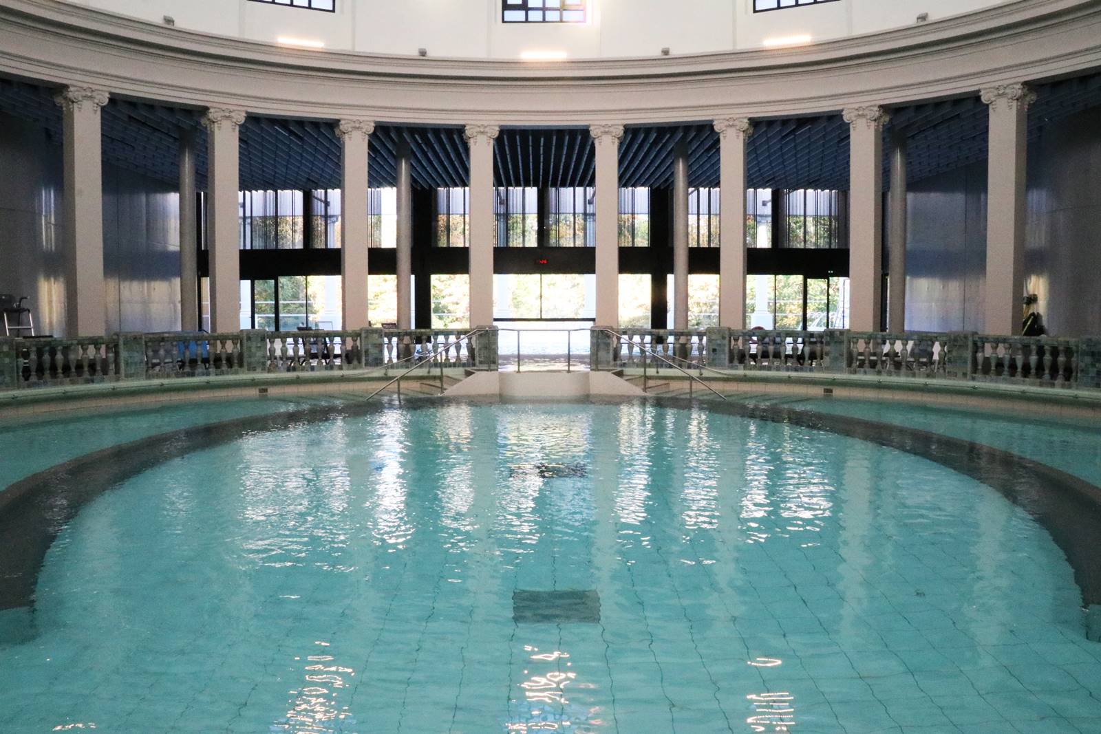 Sa coupole historique abrite une piscine ronde bordée d’une balustrade en grès flammé en camaïeu de bleu et de vert. C’était à l’époque la plus grande piscine en eau minérale naturelle au monde.