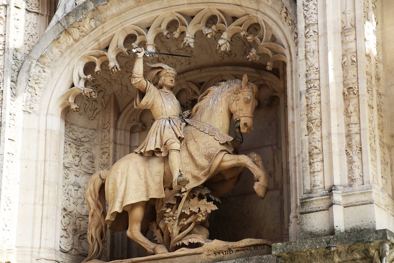 La porte abrite une statue équestre du duc Antoine. Détruite à la Révolution, la statue originale a été reconstituée en 1851.