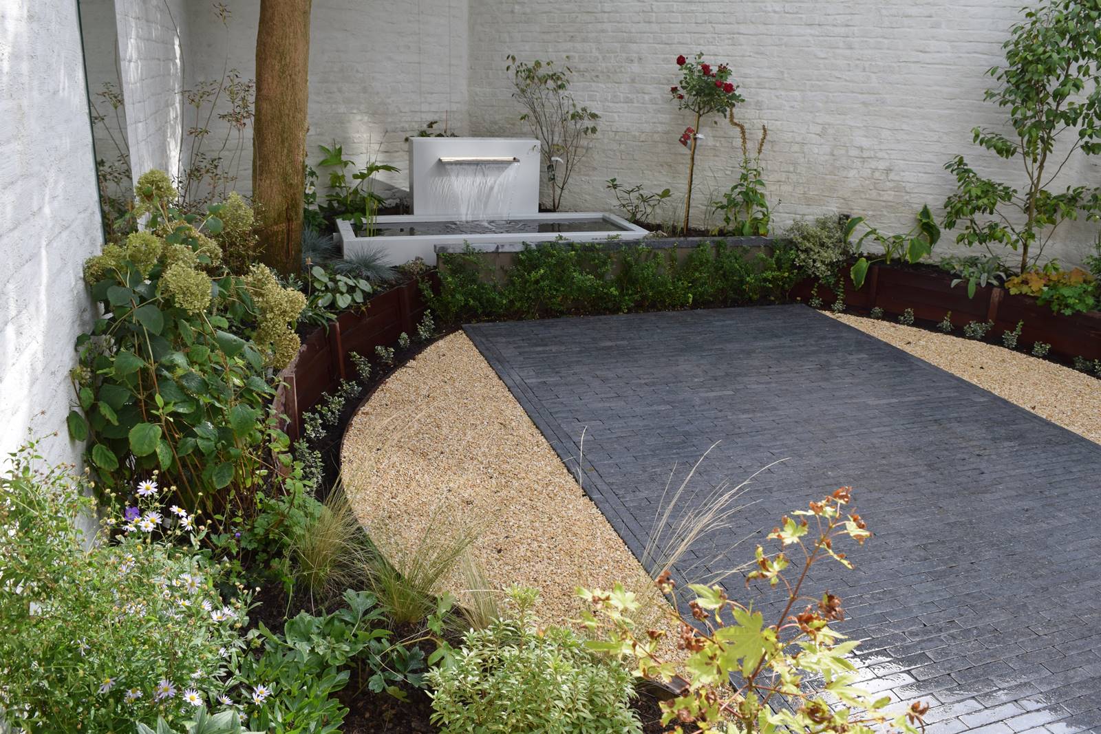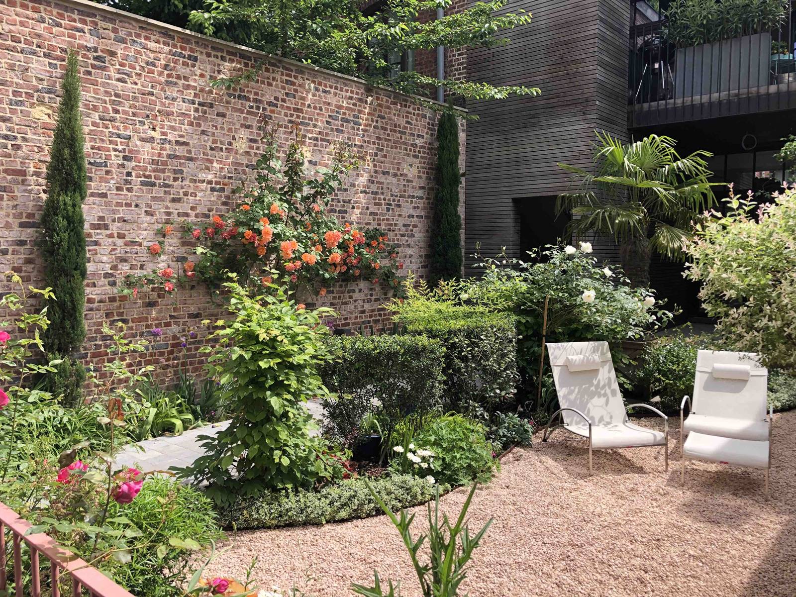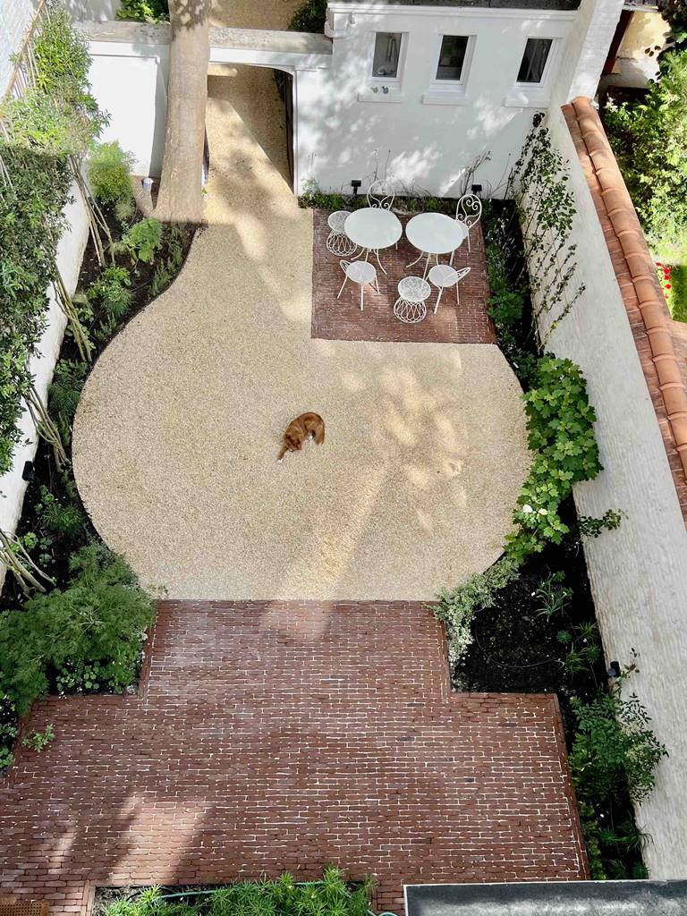 Maintenu par de fines lames en acier Corten, du gravier calcaire lumineux remplace souvent le gazon, du moins en partie. On retrouve l’acier Corten et sa patine rouillée en bordure de parterres surélevés que Nathalie crée lorsque la terre manque. Ailleurs, on découvre une terrasse en briques de terre cuite posées sur chant ou un patio en bois exotique Ipé à grande durabilité et fixation invisible.