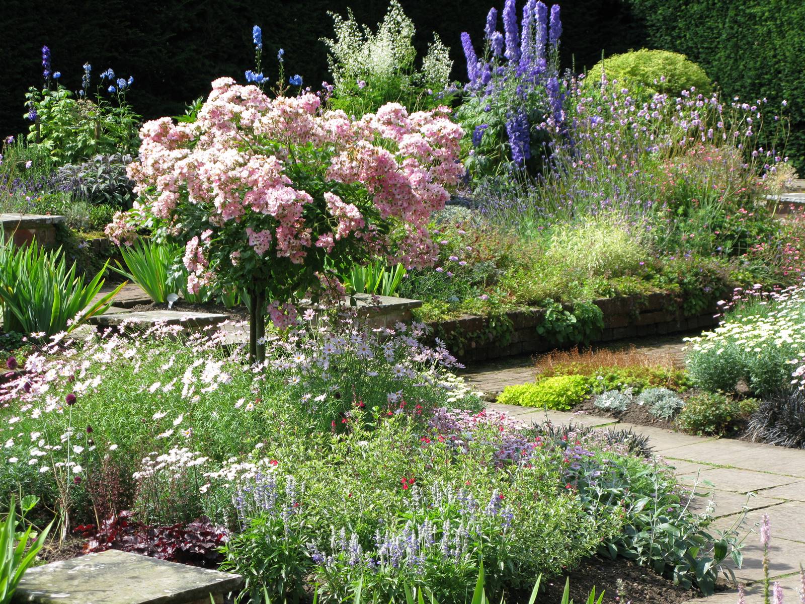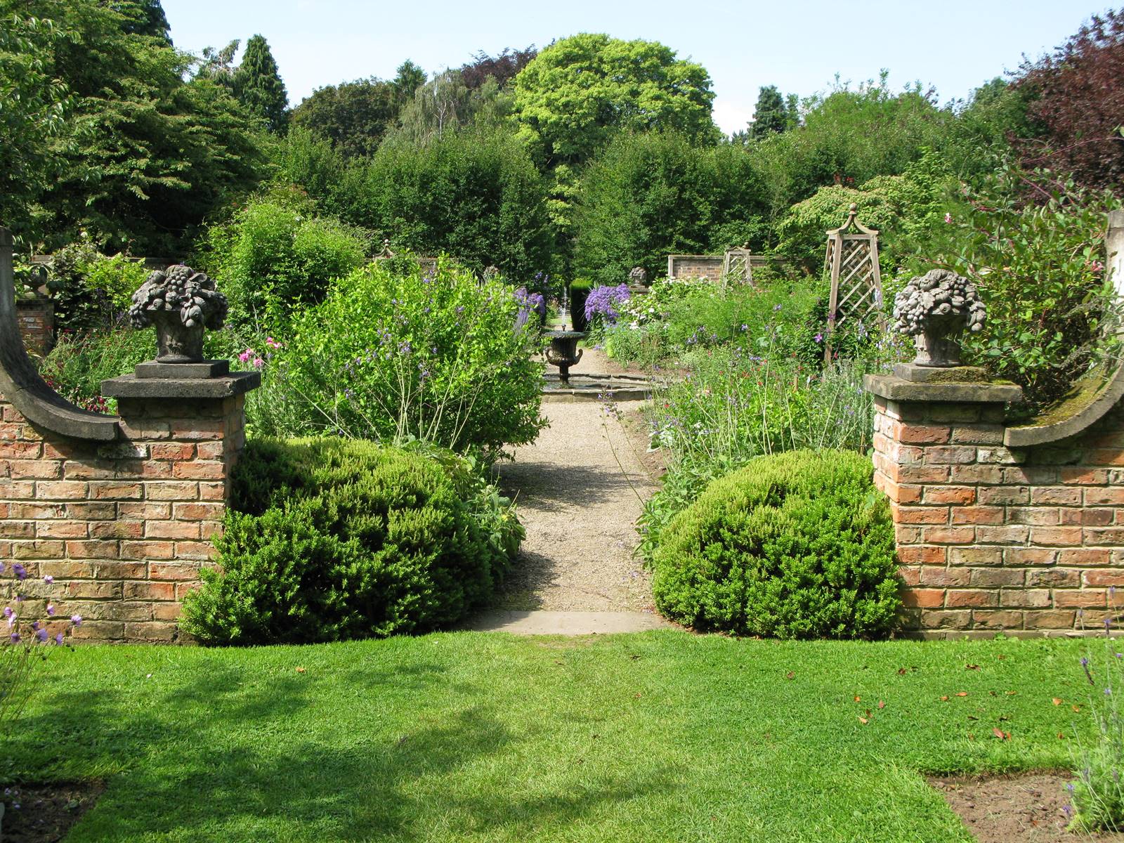 La partie la plus spectaculaire du jardin est une double bordure de plantes vivaces qui borde un axe central couvert d’une large allée de gazon qui rejoint la rivière. Au delà de vigoureuses haies d’ifs, on découvre de chaque côté des chambres de verdure animées de couleurs ou de plantes saisonnières. Plus loin, les compartiments se transforment en bosquets boisés et révèlent des vues sur la campagne.