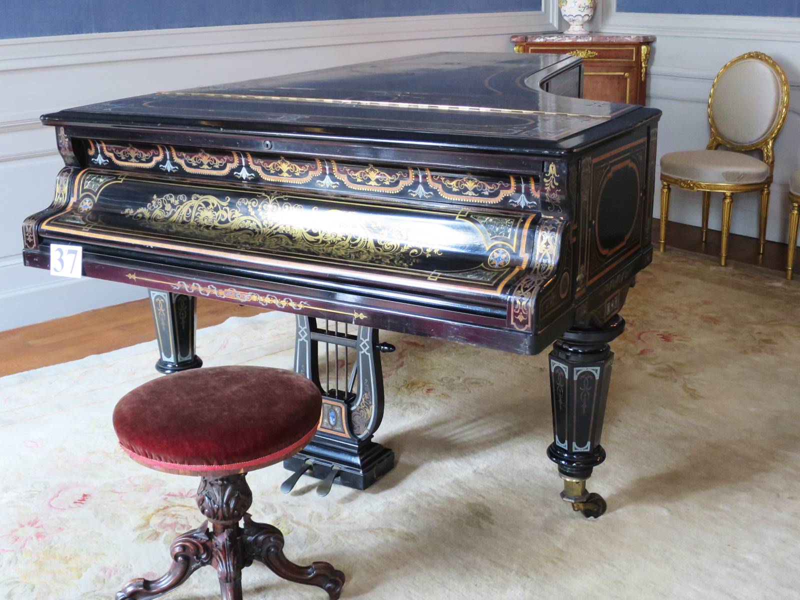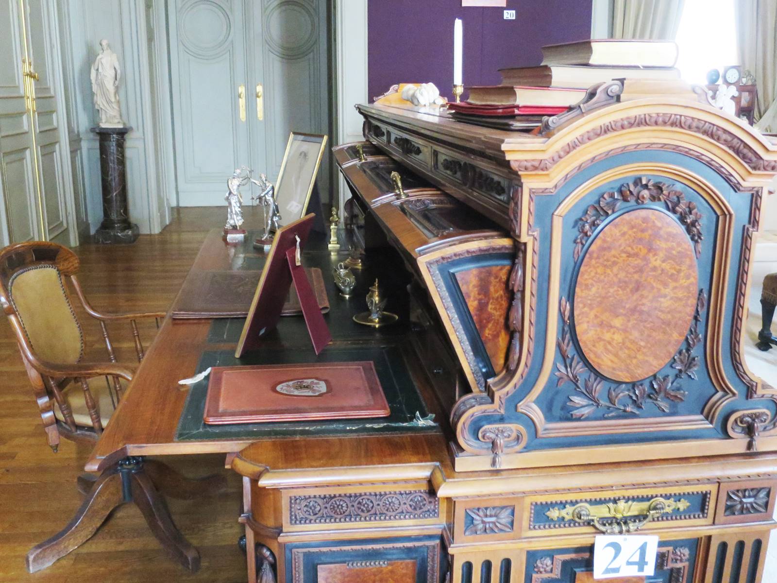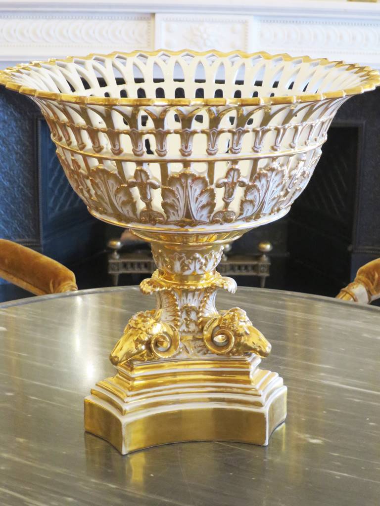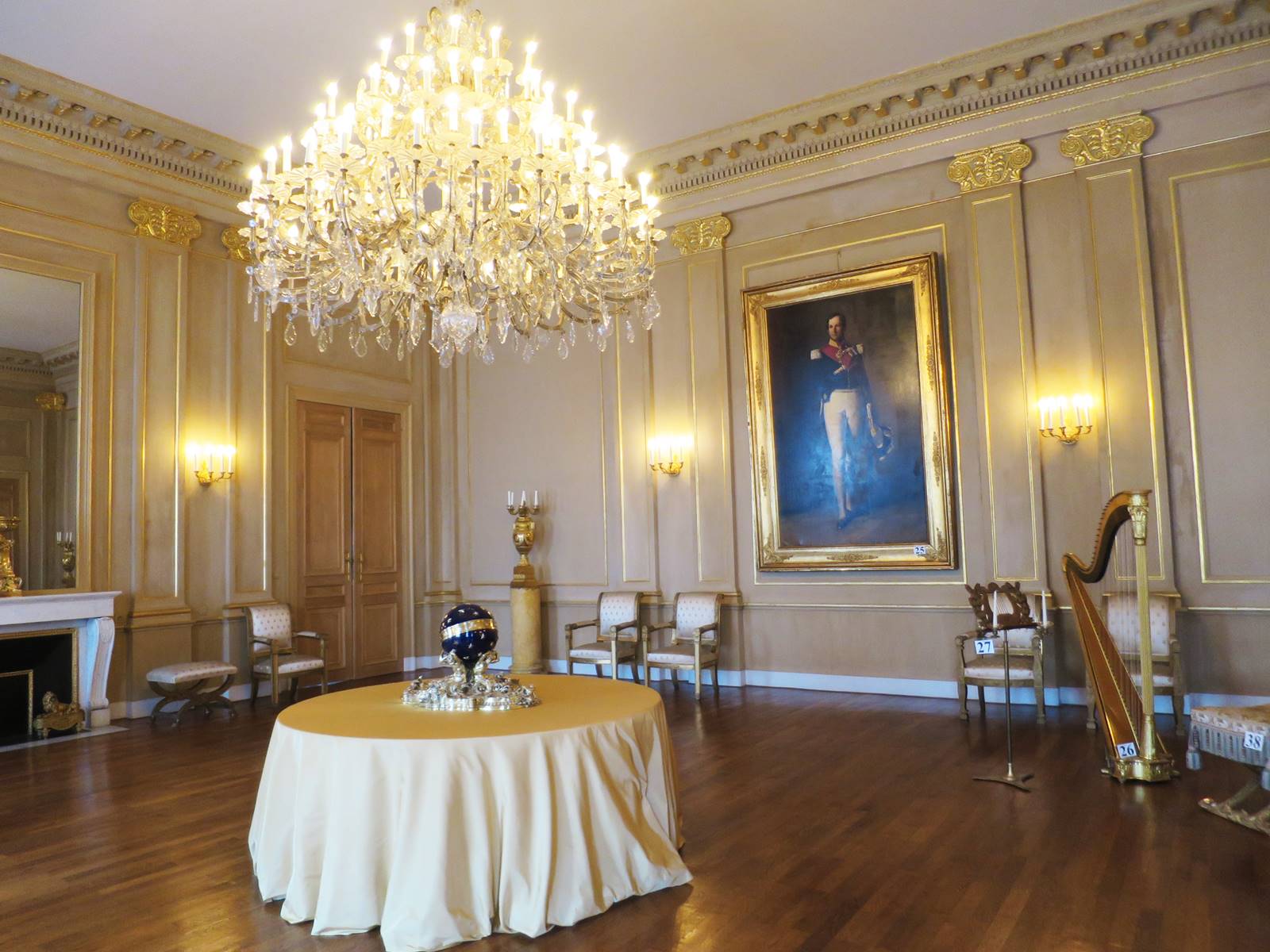 Les fauteuils Empire font partie du mobilier du Salon aux Pilastres utilisé par Napoléon Bonaparte et Joséphine de Beauharnais lors de leur séjour. La harpe et le pupitre à musique appartenaient probablement à la Reine Louise-Marie.