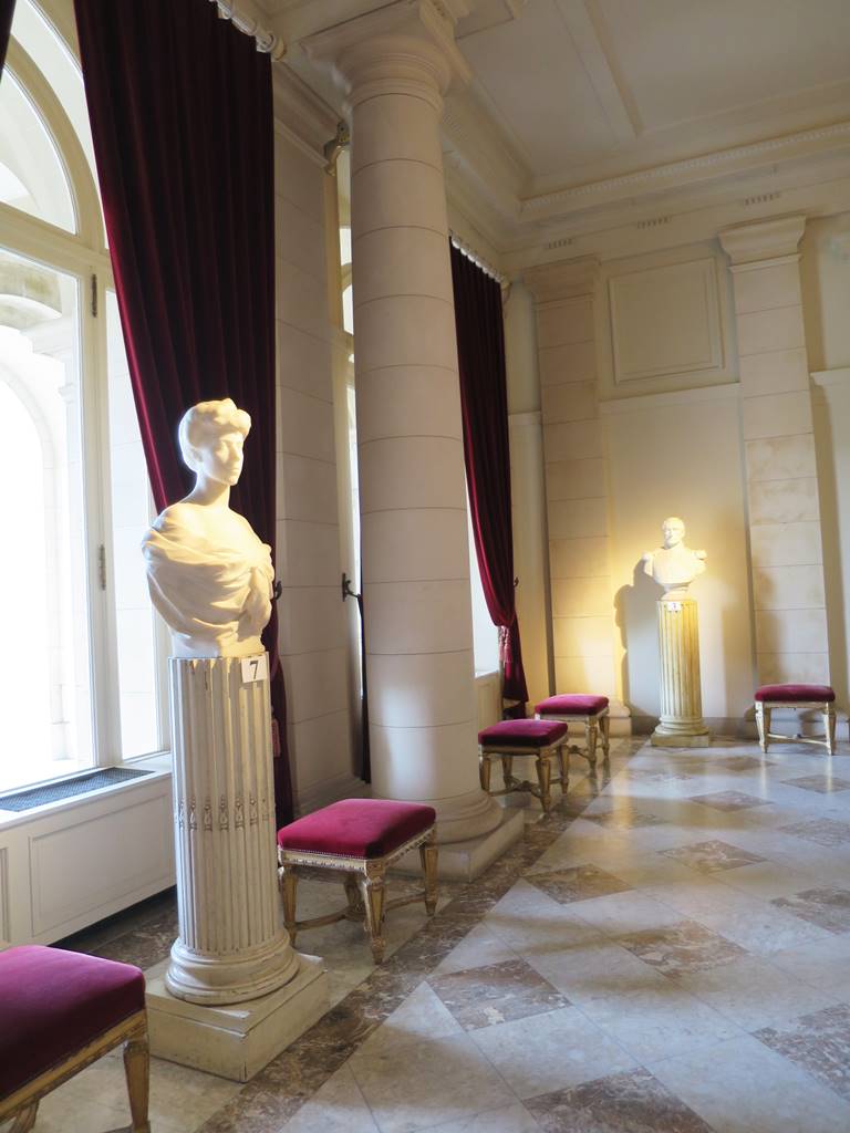 En visitant le Palais Royal de Bruxelles, j’ai suivi le parcours qu’empruntent les diplomates étrangers lorsqu’ils vont remettre au Roi leurs lettres de créance. Les bustes qui décorent le vestibule d’honneur représentent les Rois et les Reines des Belges. Sur la gauche, c’est le buste de la reine Elisabeth qui m’accueille. Née duchesse de Bavière et épouse du roi Albert Ier des Belges, on lui doit le Concours musical international Reine Elisabeth.