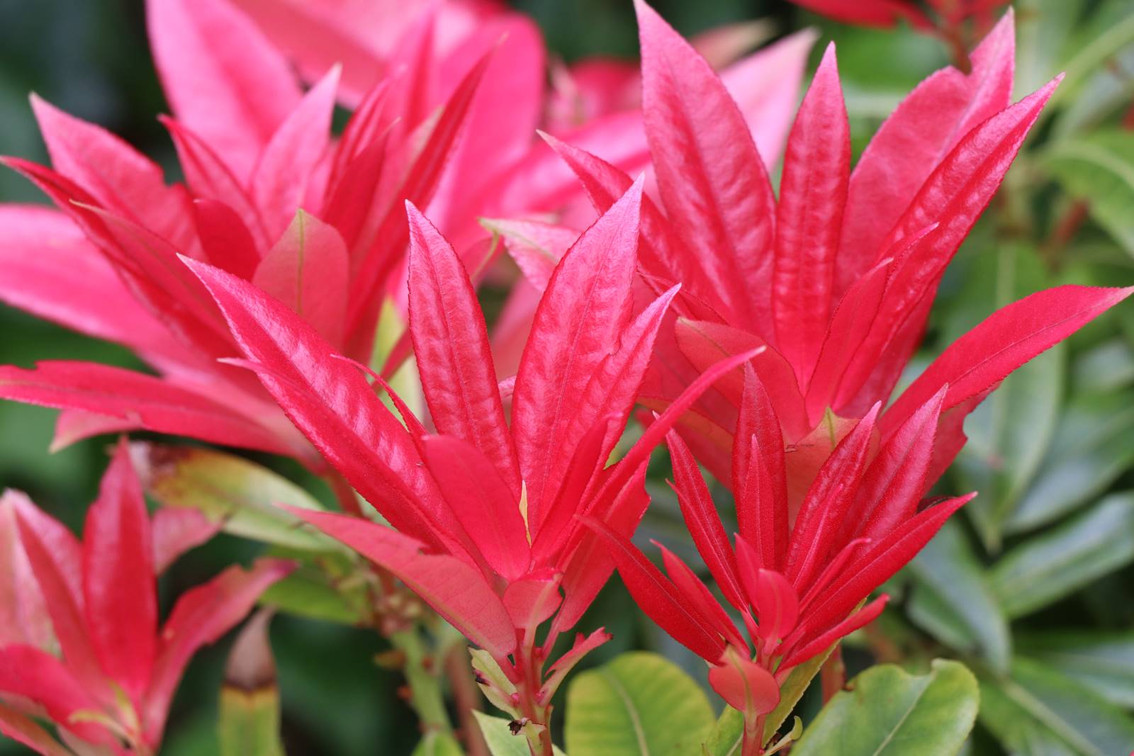 Les jeunes pousses du Pieris japonica ‘Mountain Fire’ sont rouge vif et virent ensuite au brun châtain lustré puis au vert foncé. (h. 1m)