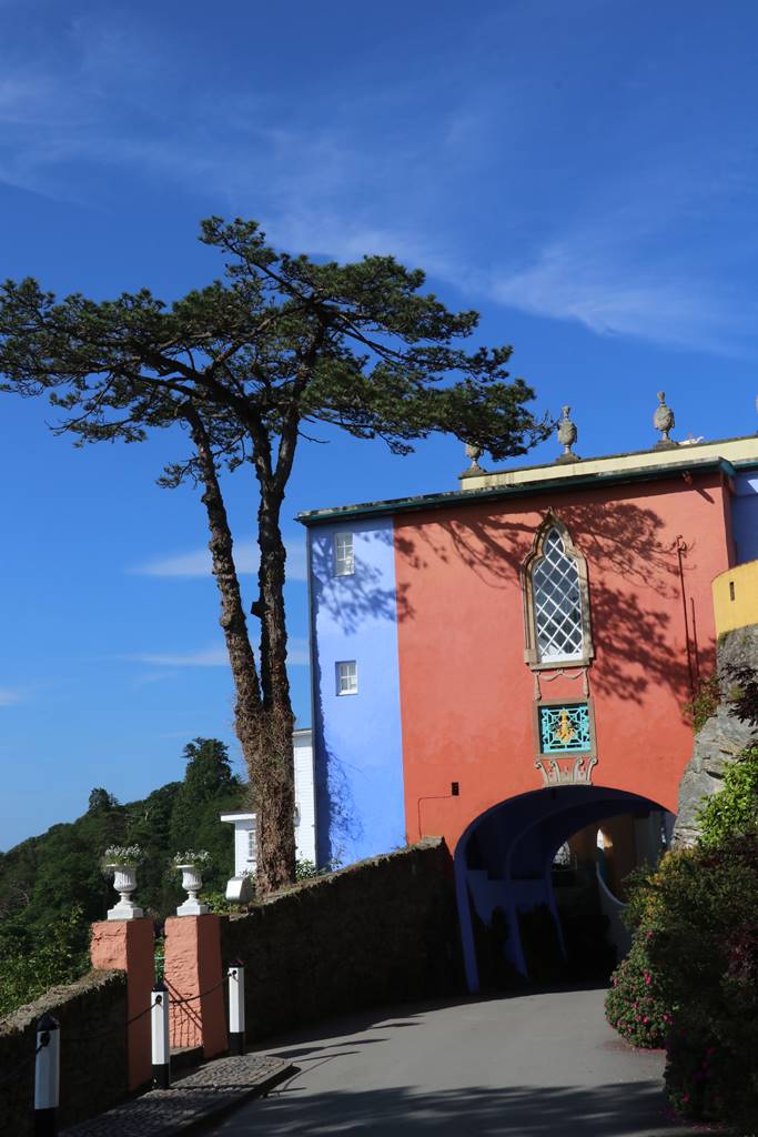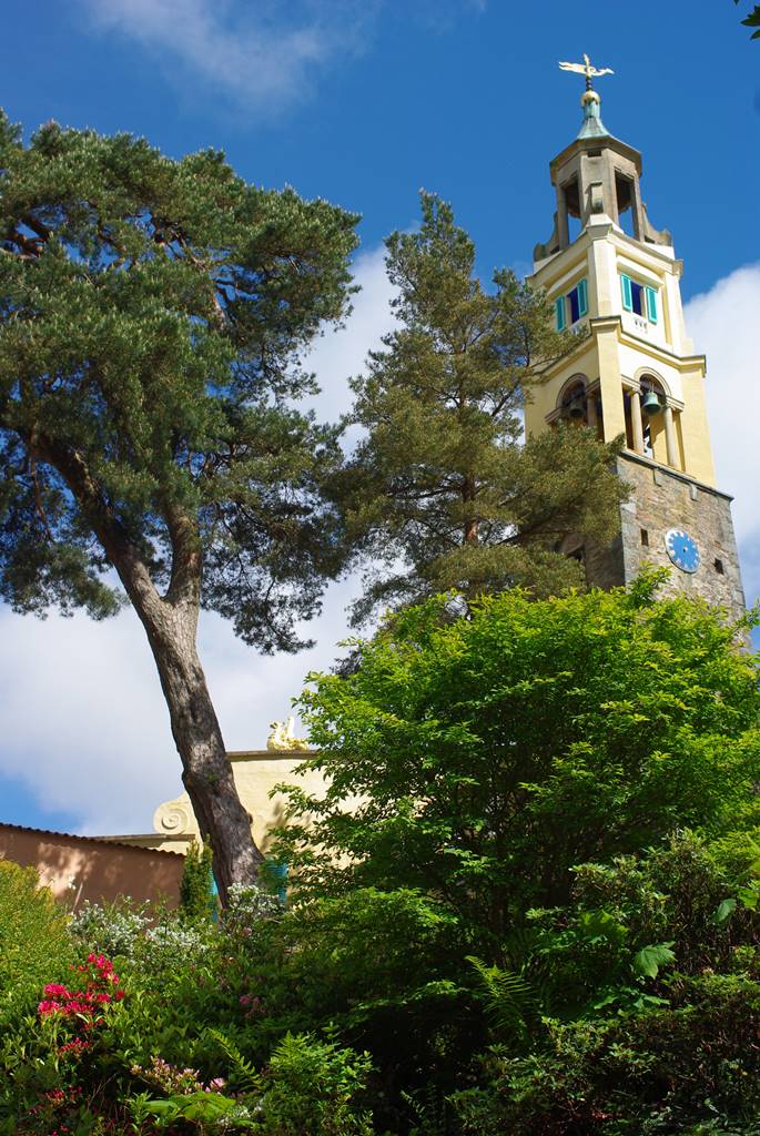 Adossé au massif montagneux du Snowdonian en terre galloise, Portmeirion est un village de vacances qui attire une foule de touristes. Avec sa place centrale ‘The piazza’ ornée de colonnades, son campanile ‘The Bell Tower’, son belvédère, ses maisons fardées d’ocre jaune et rouge et son petit port, on se croirait sur la riviera italienne surtout lorsque le ciel est bleu.