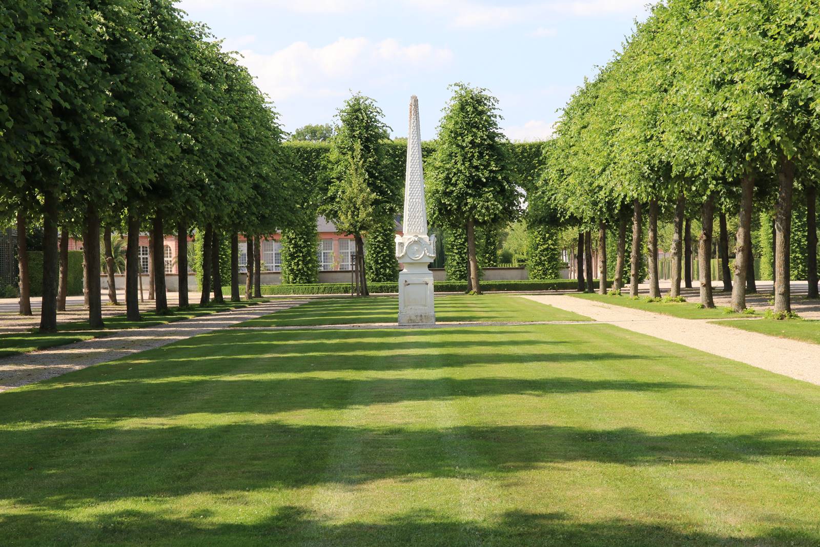 Dans l’axe transversal du Grand Cercle, quatre parterres de gazon bordés de tilleuls palissés sont agrémentés d’un obélisque en position centrale. Dans le prolongement de cet axe, des portiques aux arcades de tilleuls taillés forment un écrin de verdure qui referme le cercle.