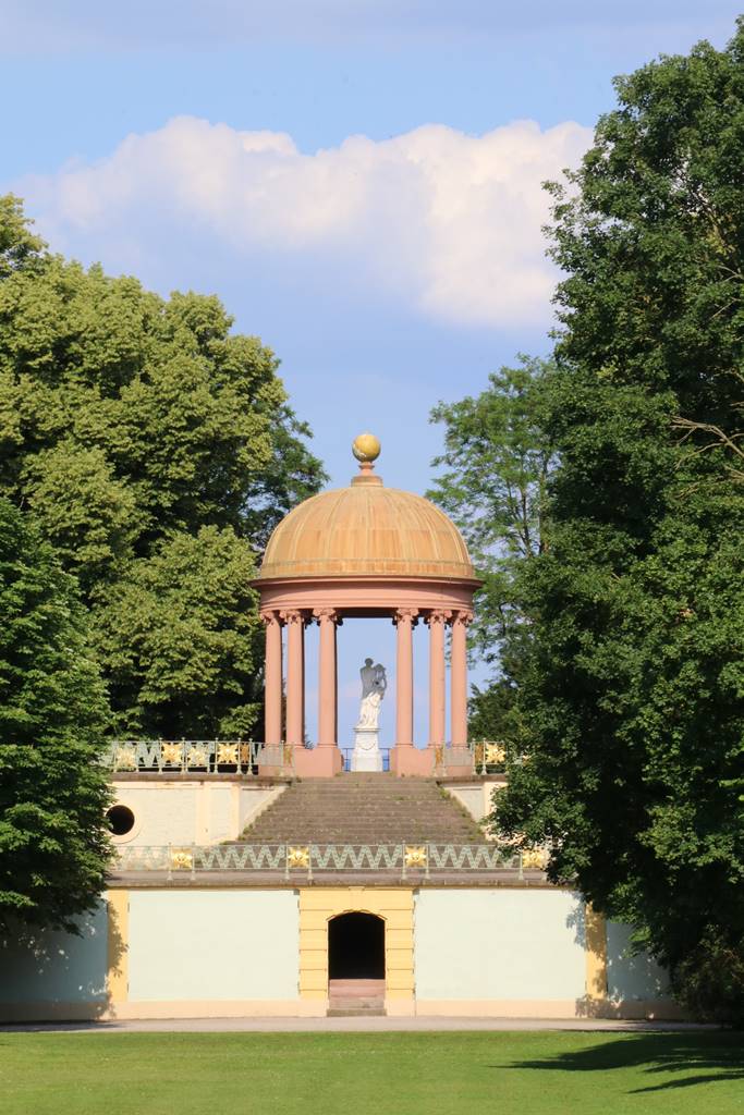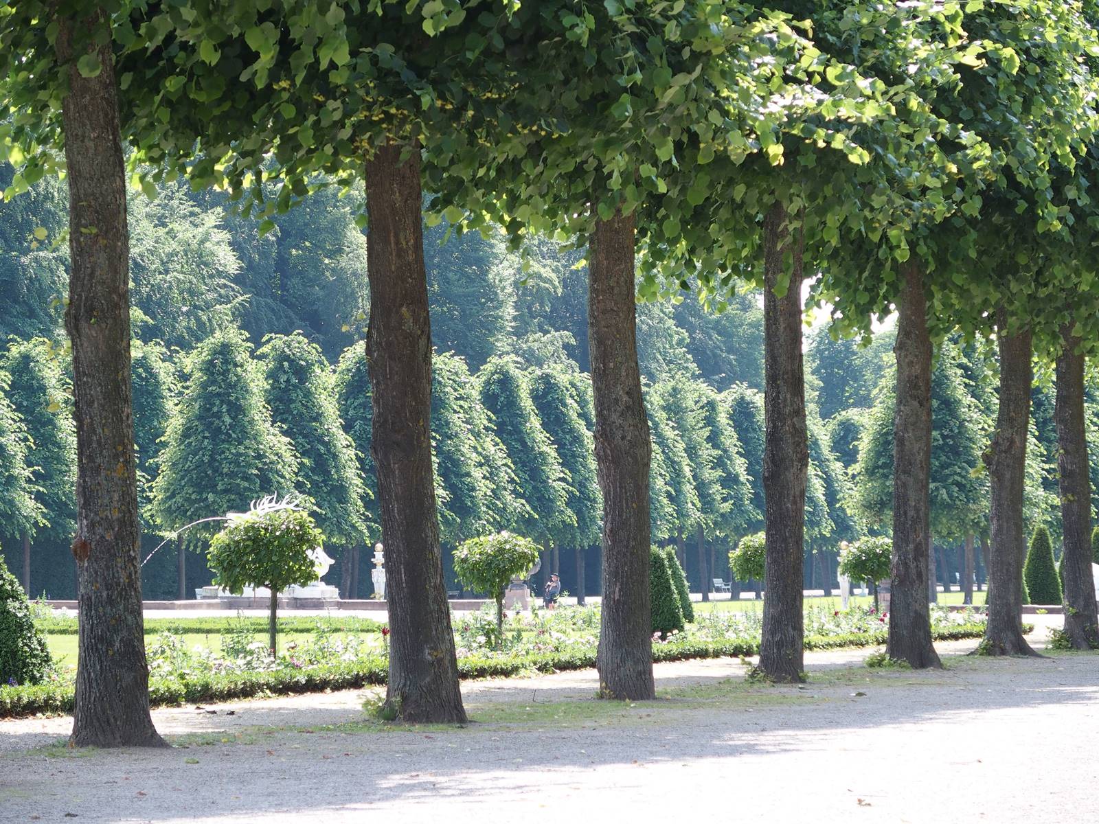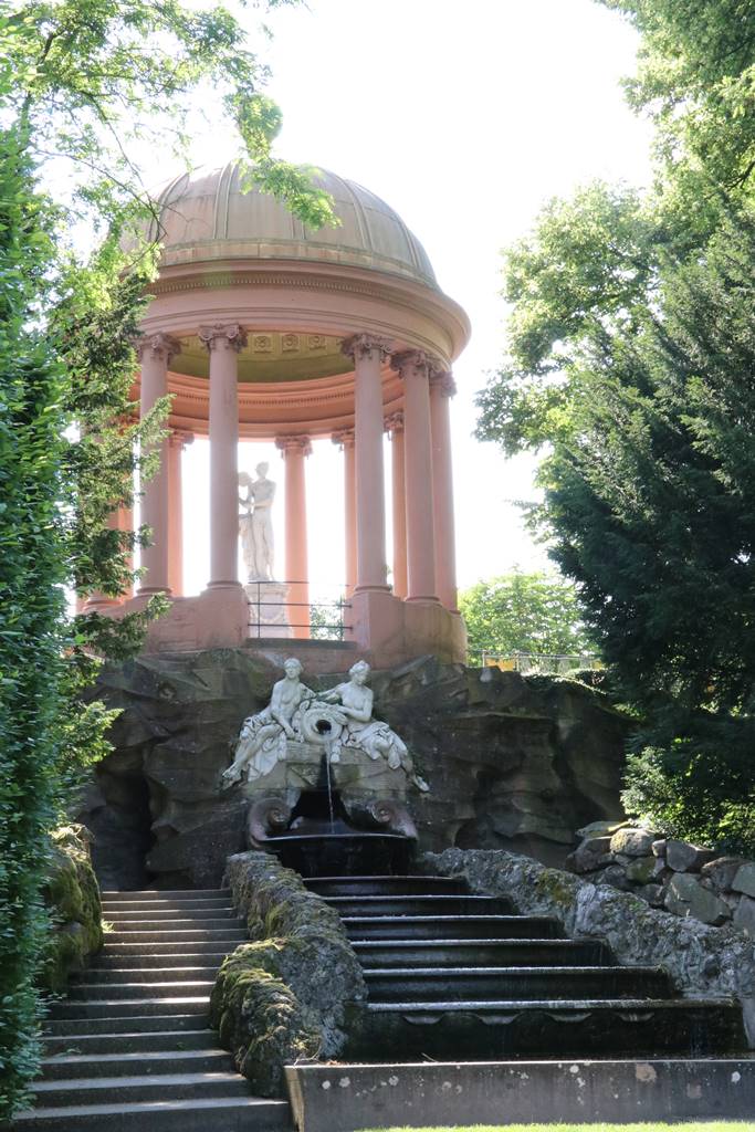 Derrière les parterres, de longues et élégantes allées formées par des tilleuls palissés semblent s’avancer à l’infini, comme à Versailles. A partir de 1762, Nicolas de Pigage dirigea la réalisation de la quasi-totalité des jardins et une série d’édifices dont une mosquée turque, de fausses ruines, le Temple de Mercure, le Temple de Minerve et le temple d’Apollon. Plus de cent sculptures ornent le parc de Schwetzingen réalisées pour la plupart par le sculpteur de la cour, Peter Anton von Verschaffelt.