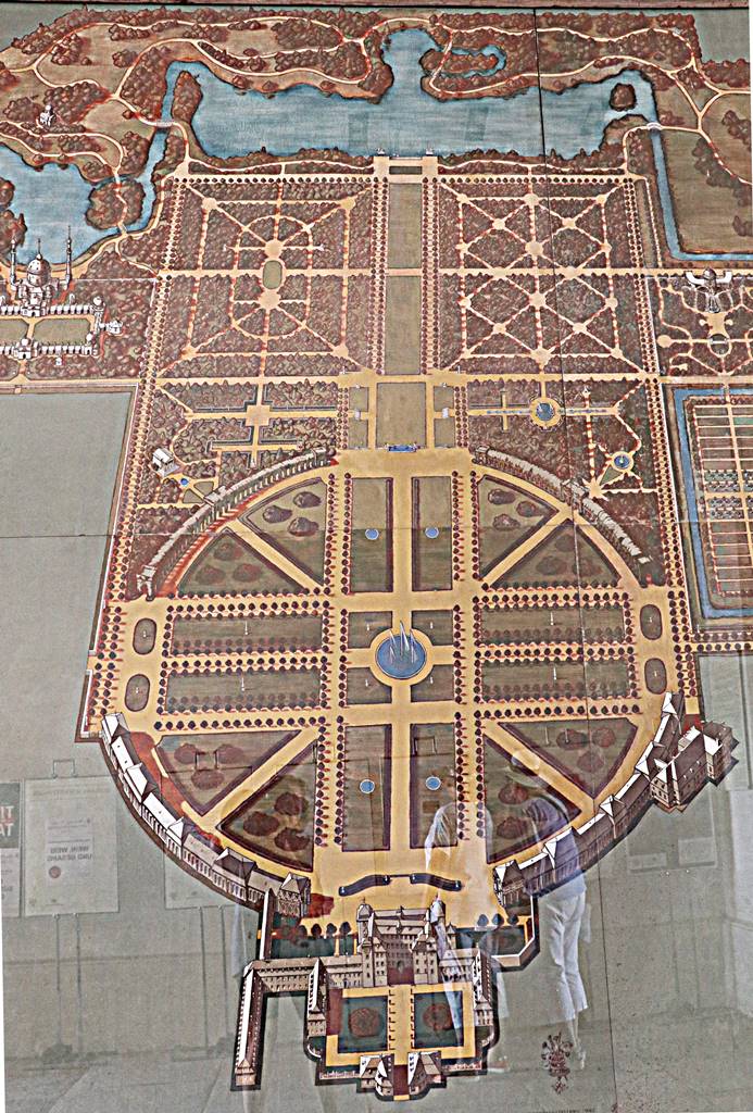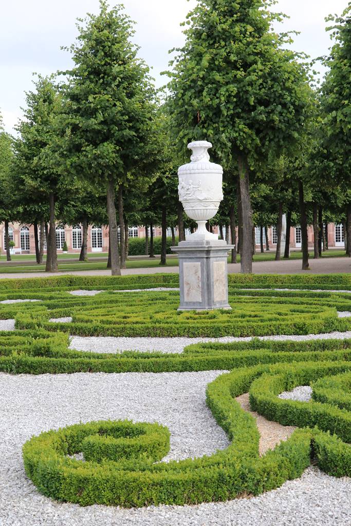 Le jardin au pied de la terrasse du château de Schwzetzingen a été dessiné par Johann Ludwig Petri en 1753. Bordé par les deux ailes du château érigées pour abriter les plantes en caisse pendant l’hiver, il forme un cercle parfait avec des berceaux en treillage courbes, des galeries et des parterres en parfaite symétrie. L’axe principal qui part du château s’étire en direction de l’ouest avec une profusion de broderies de buis, de bassins et de jeux d’eau. C’est un espace ouvert, baigné de lumière, aménagé comme une salle des fêtes en plein air.
