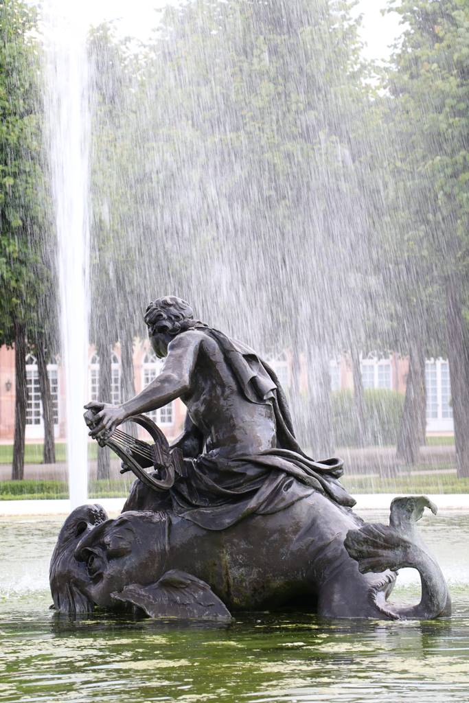 Située au centre du grand jardin baroque, la fontaine d’Arion évoque le poète lyrique grec Arion. D’après la légende, il aurait été sauvé de la noyade par un des dauphins d’Apollon. La fontaine est animée par un jet qui s’élève à quinze mètres, ce qui était une prouesse à l’époque de sa création. La fontaine d’Arion est complétée par quatre autres fontaines plus basses peuplées de putti chevauchant des animaux cracheurs d’eau, cygnes ou monstres marins. Ce groupe sculpté de Barthélemy Guibal provenait de l’héritage de Stanislas Leszczynski, roi de Pologne et duc de Lorraine. (voir mon reportage sur Nancy)