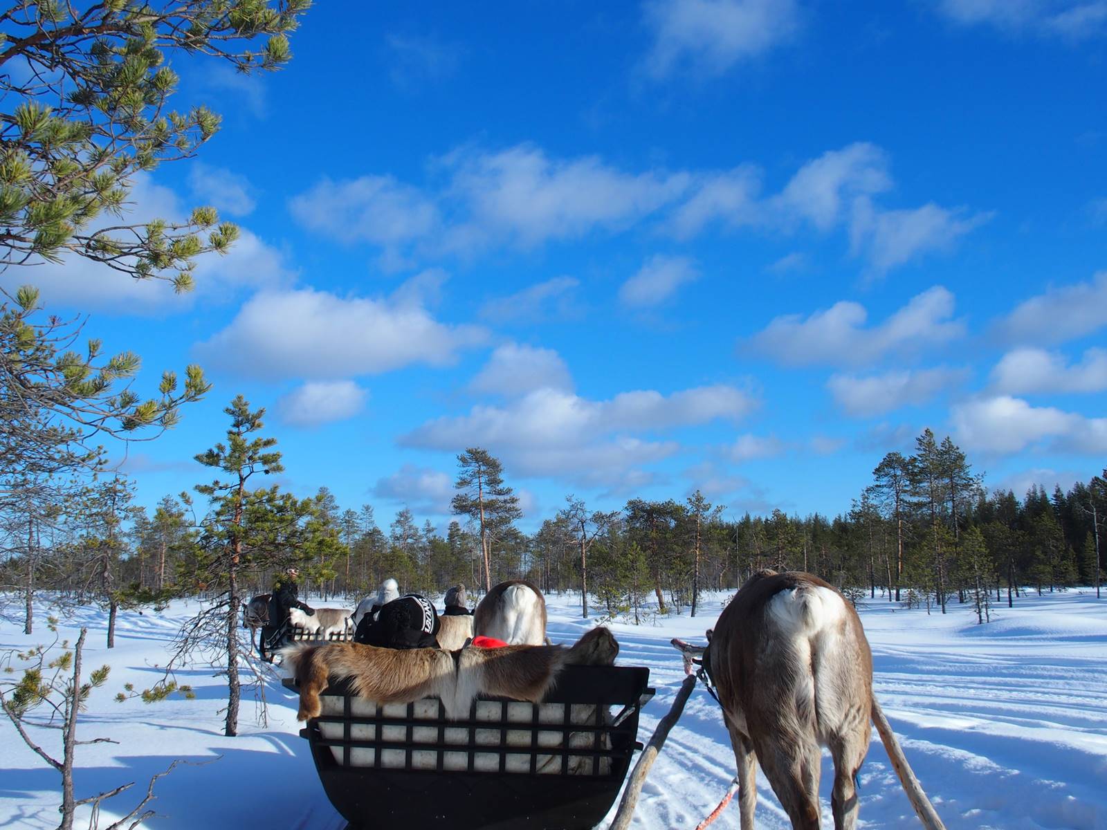 Les traîneaux tirés par les rennes préparés pour le safari sont rassemblés en lisière de la forêt. Je m’installe confortablement dans un traîneau sur une peau de renne, protégée du froid par une couverture.