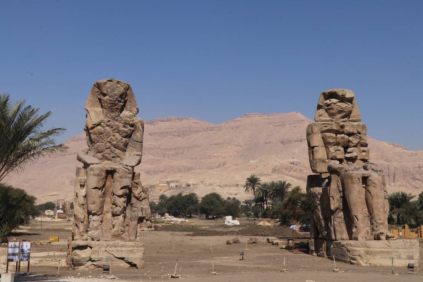 Avant d’arriver au coeur de la nécropole de Thèbes, le long de la route se dresse la masse énorme des célèbres Colosses de Memnon. Imperturbables, ces deux statues monumentales de quartzite rose représentent Aménophis III assis sur un trône de pierre où figure le symbole d’union de la Haute et de la Basse Egypte. Ces statues d’une vingtaine de mètres de hauteur sont les vestiges du gigantesque temple construit par le pharaon durant le 18e dynastie sur la rive ouest de Thèbes. Elles ont été dégradées dit-on à la suite d’un tremblement de terre survenu en 27 av. J.C.. C’est depuis ce moment là, semble-t-il, et jusqu’à sa restauration au début du 3e siècle, que l’un des colosses se mit à « chanter » au lever du jour sous la caresse du vent.