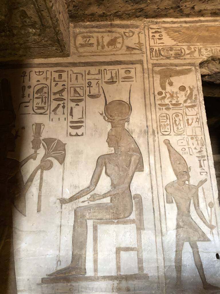 A l’intérieur du temple, les parois illustrent les conquêtes militaires de Ramses II contre les Hittites. Deux fois l’an, lors des solstices de février et d’octobre, au point du jour, les rayons du soleil baignent toute la longueur du temple, éclairant les statues du sanctuaire.
