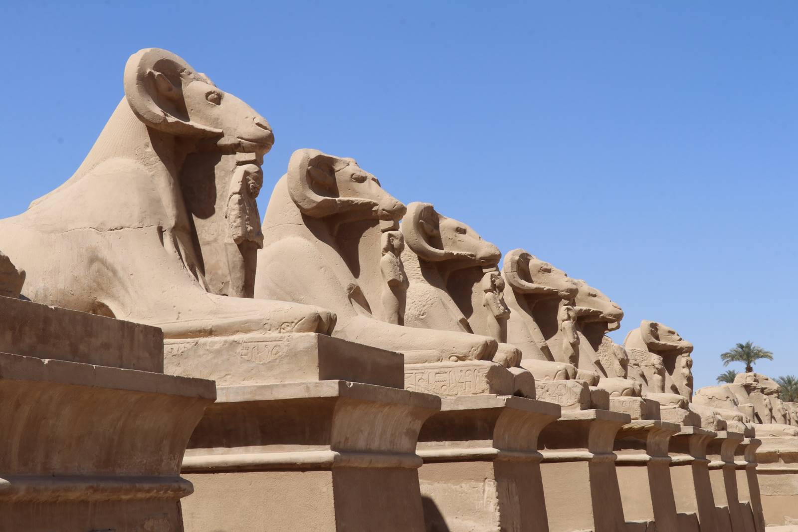 Les temples sont reliés à la berge du fleuve par une allée monumentale bordée de 40 sphinx à corps de lion et à tête de bélier ou tête humaine. Chacun protège entre ses pattes une statuette du pharaon.