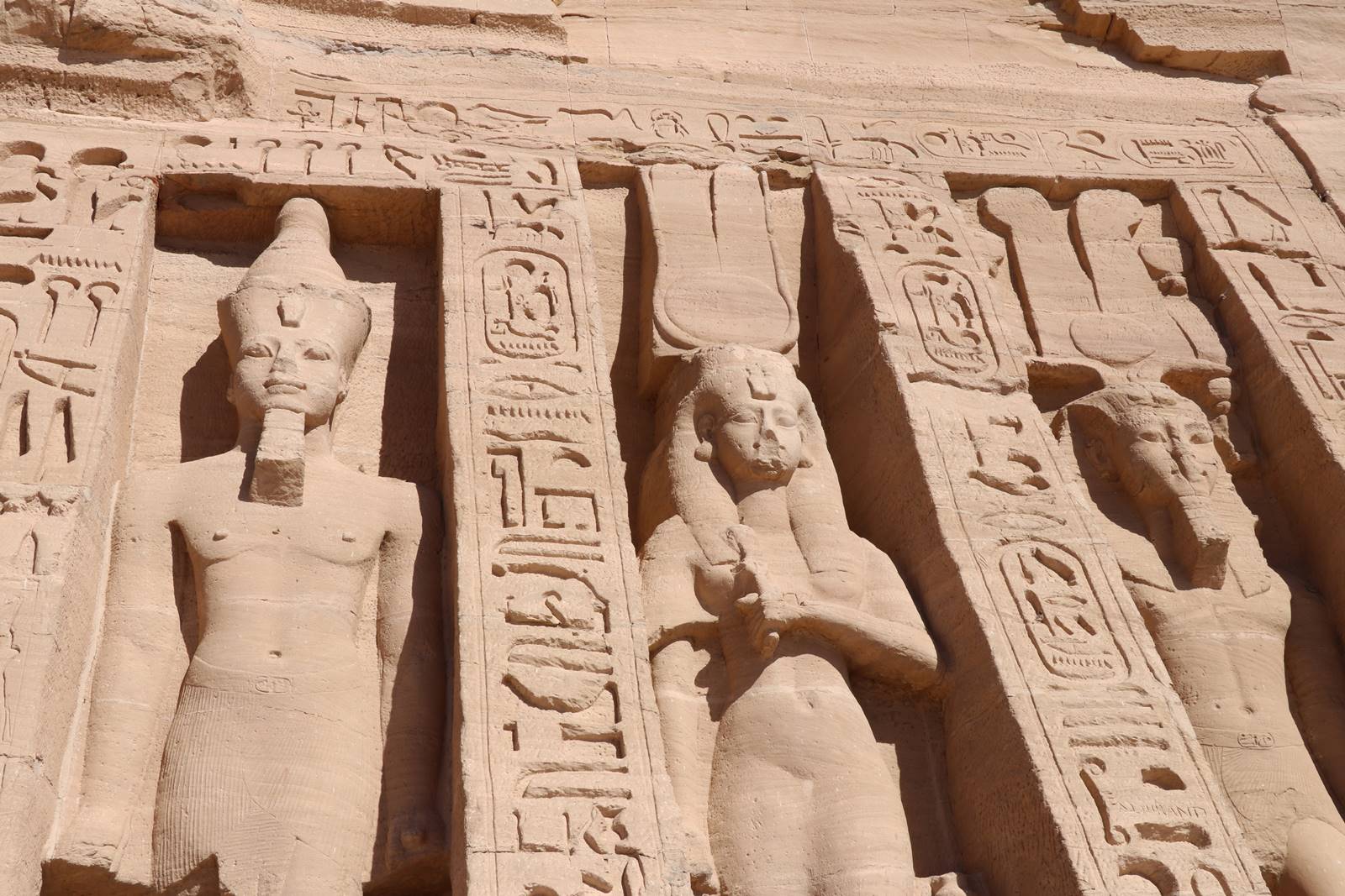La façade du temple de Néfertari reprend le thème du colosse royal de Ramses II entouré de l’effigie de son épouse Néfertari dans son costume d’Hathor-Sothis et de leurs enfants. Jamais, dans l’Egypte des pharaons, l’épouse d’un souverain n’avait été sculptée aussi grande que celle du pharaon sur la façade d’un temple. Dans le pronaos, le roi massacre les différents peuples ennemis de l’Egypte tandis que son épouse fait des offrandes aux déesses Mout et Hathor.