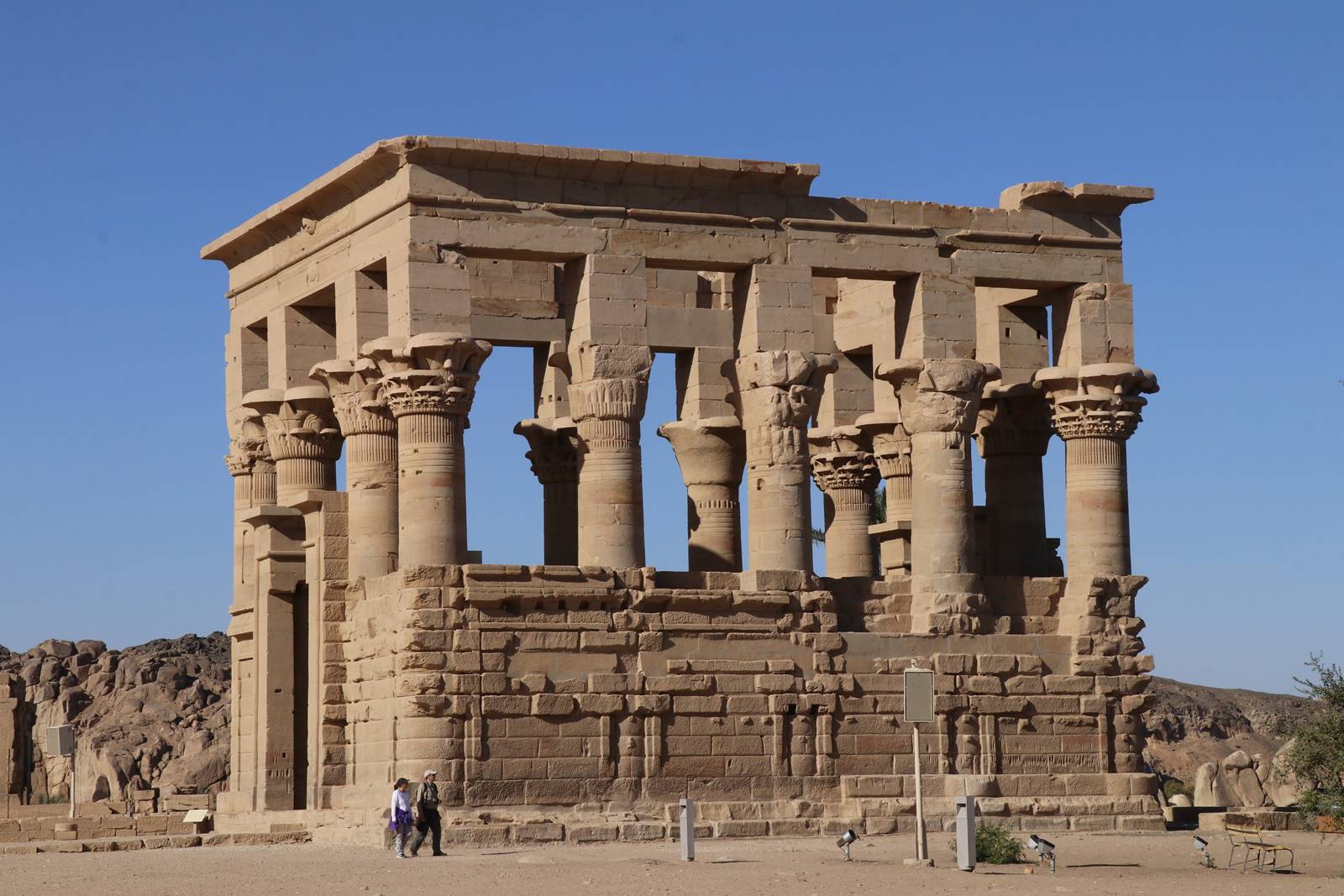 Edifié au 2e siècle av. J.C., un temple est dédié à Hathor, nourrice des pharaons et déesse de la Musique et de la Joie. Il met en scène des musiciens jouant de la harpe, de la flûte et du tambourin. L’édifice à colonnes finement décoré devait servir d’embarcadère lors des festivités où la déesse était portée en procession en dehors de l’île.