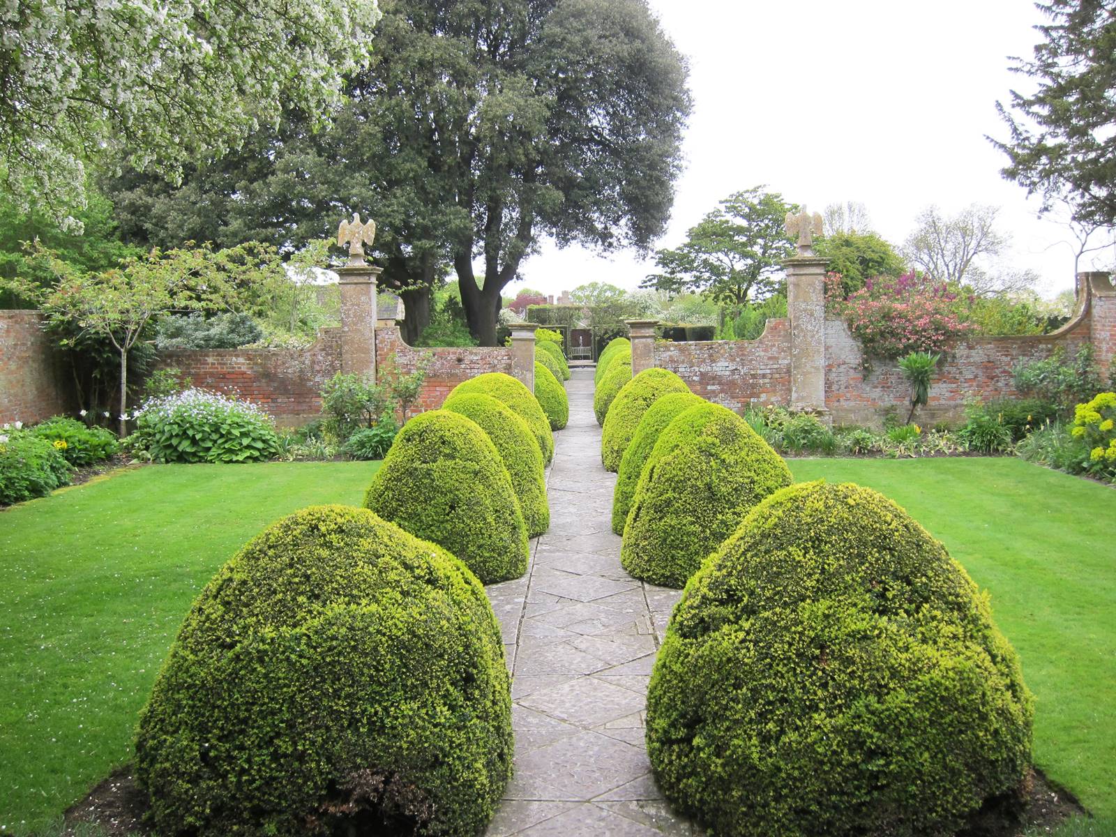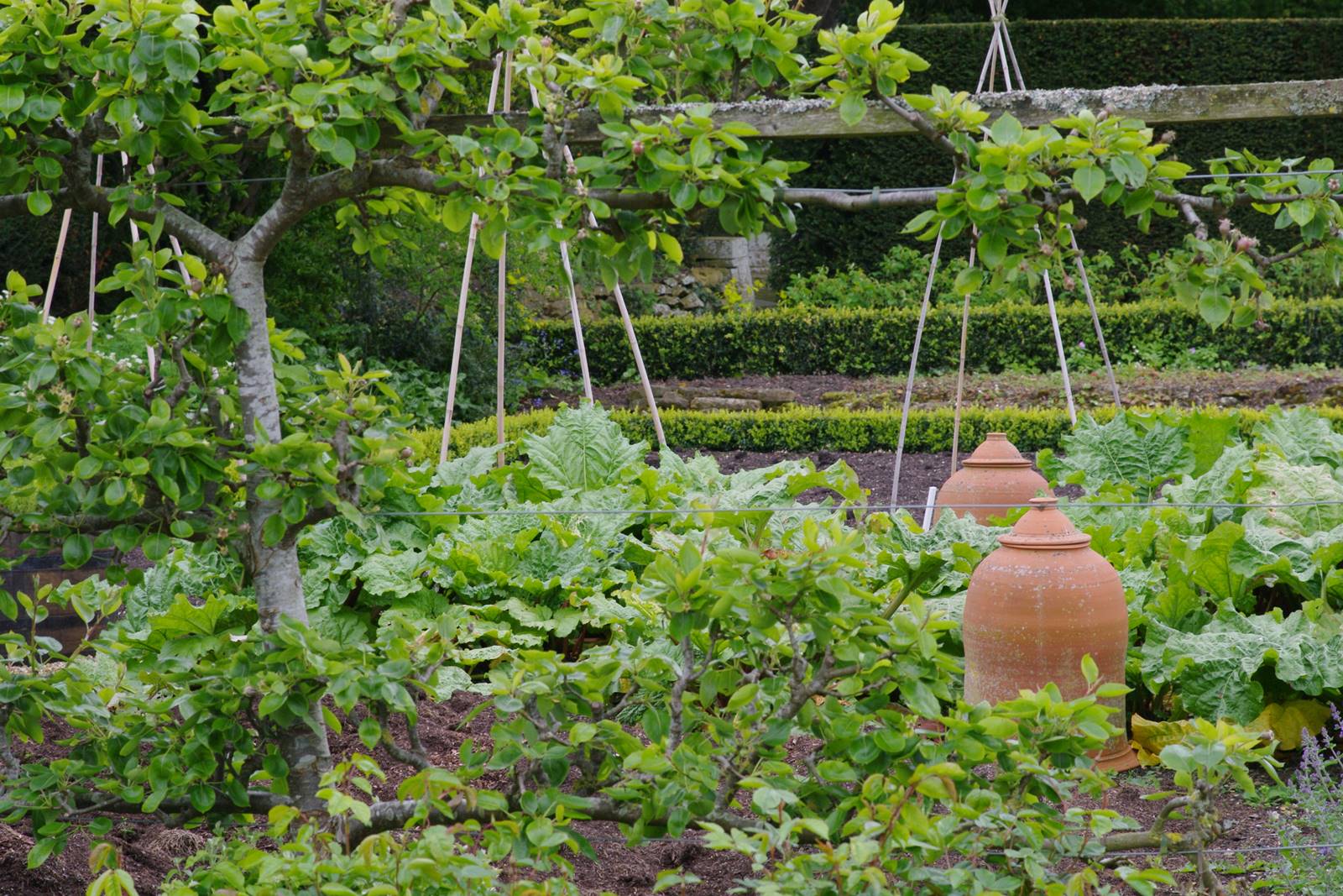 Tintinhull possède quelques arbres remarquables comme un immense cèdre du Liban et des ifs vénérables qui donnent de l’ampleur au jardin et déterminent des zones d’ombre et de lumière. Dans le vaste potager décoratif mais sans prétention, les arbres fruitiers palissés alternent avec les planches de légumes alignés. Les cultures se succèdent au fil des saisons.