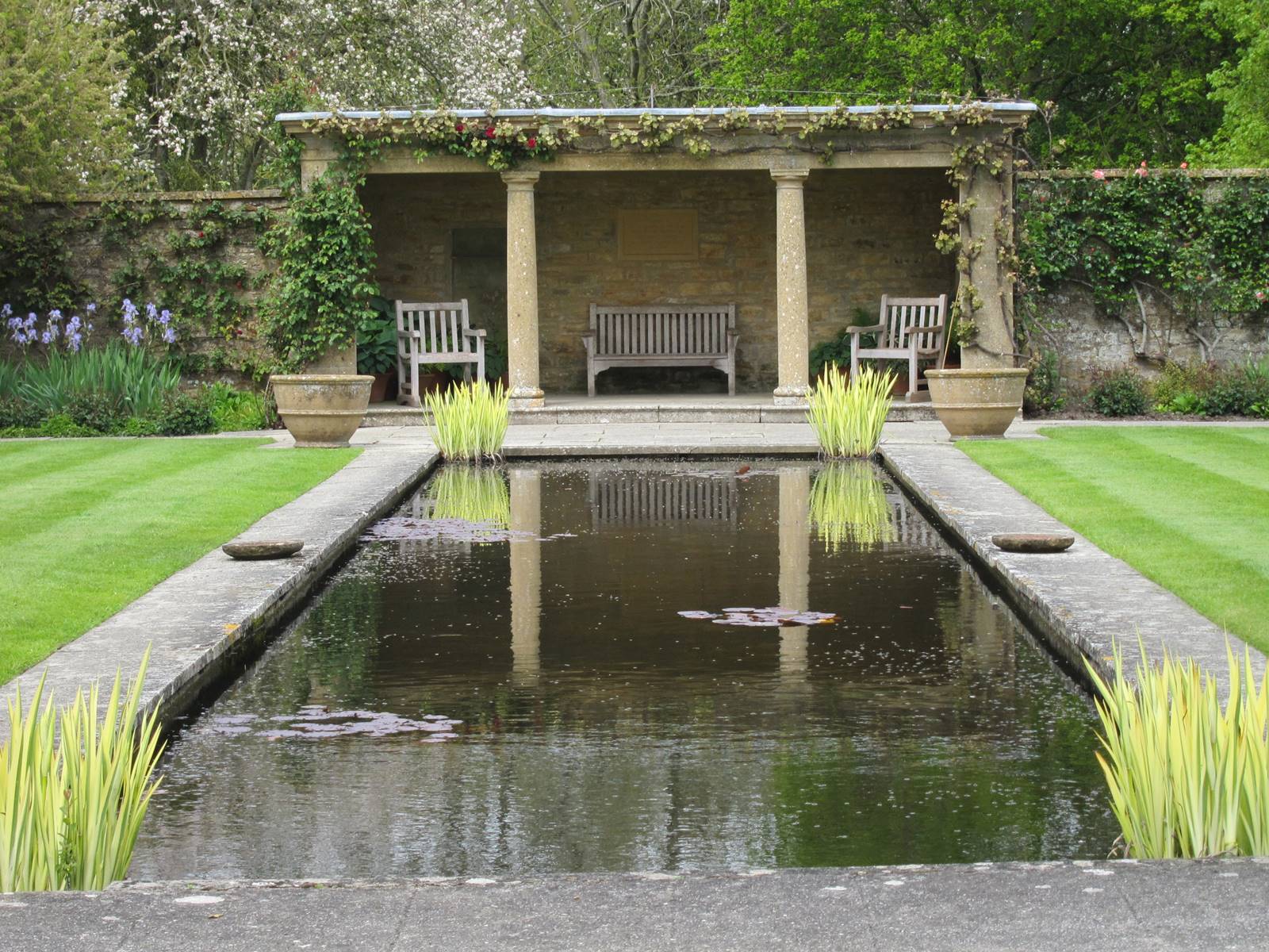 Cette chambre de verdure qui est le coeur du jardin est agrémentée d’un long bassin aux allures de canal. Créé par Phyllis Reiss à la mémoire de son neveu, un pilote abattu au cours de la Seconde Guerre mondiale, cette pièce d’eau est ornée d’une loggia ouverte et de pots soigneusement plantés. De part et d’autres s’étendent deux magnifiques plates-bandes fleuries, l’une dans les tons chauds, l’autre dans les tons pastels et argentés.