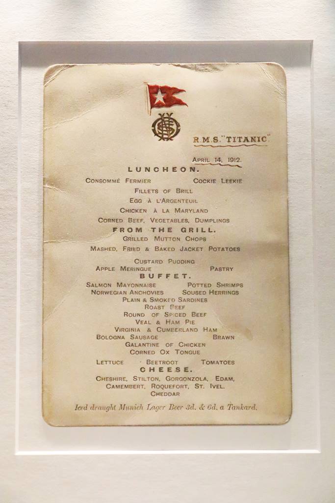 La vie à bord est rythmée par les repas. Ce menu est le dernier déjeuner servi aux passagers de la première classe sur le Titanic. Il témoigne de l’abondance des plats offerts. Menu de la Première classe, 14 avril 1912, donné par le steward Frederick Dent Ray au Dr. Washington Dodge.