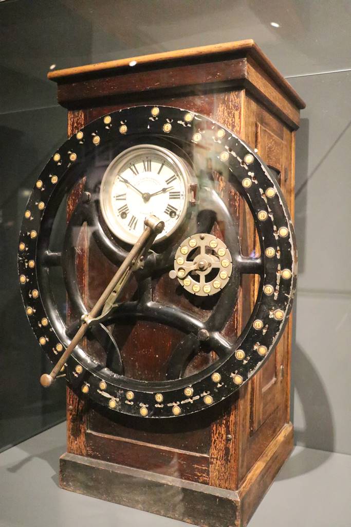 Lorsqu’un iceberg surgit, la vigie Frederick Fleet située sur le mat de misaine à l’avant du navire donne l’alerte. Le premier officier Murdoch qui est de quart sur la passerelle ordonne à la salle des machines de battre ‘en arrière toute’ et au quartier-maître qui est à la barre de virer à bâbord. Harland & Wolff time clock horloge.