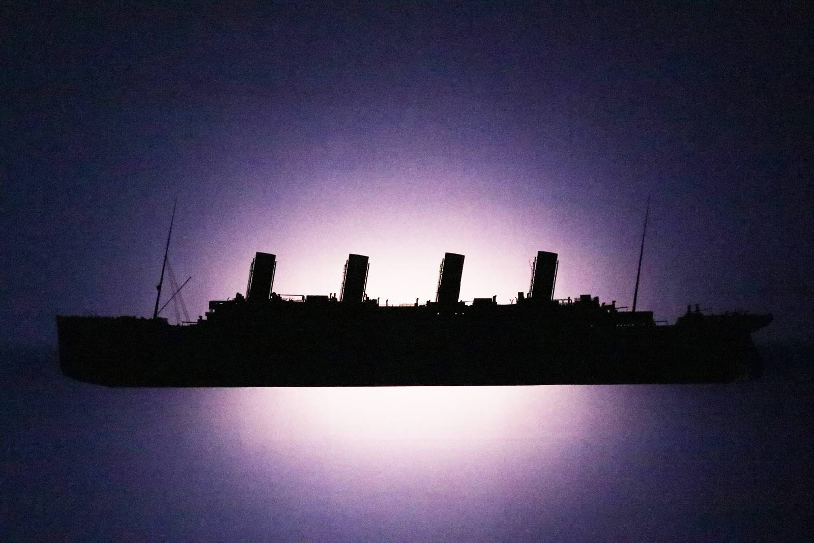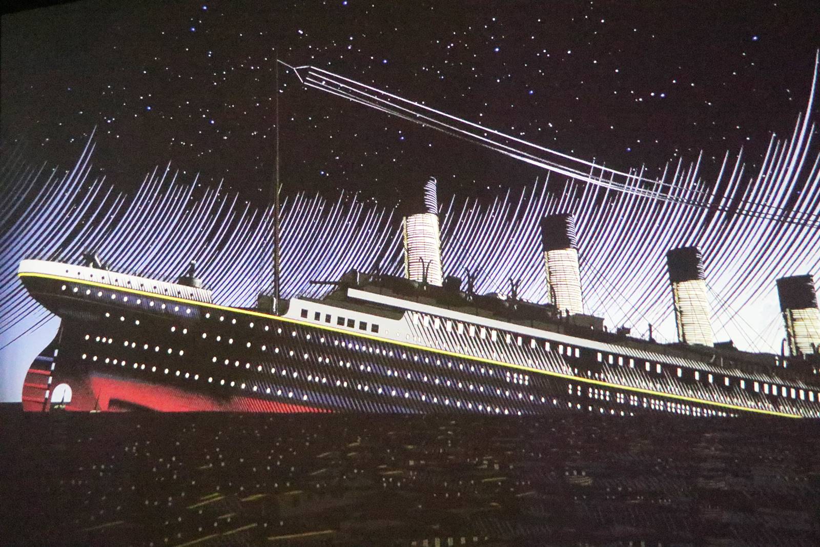 La nuit, le Titanic est illuminé de la proue à la poupe par les lumières des cabines et des salles de réception ainsi que celles qui éclairent les ponts supérieurs pour la promenade nocturne.