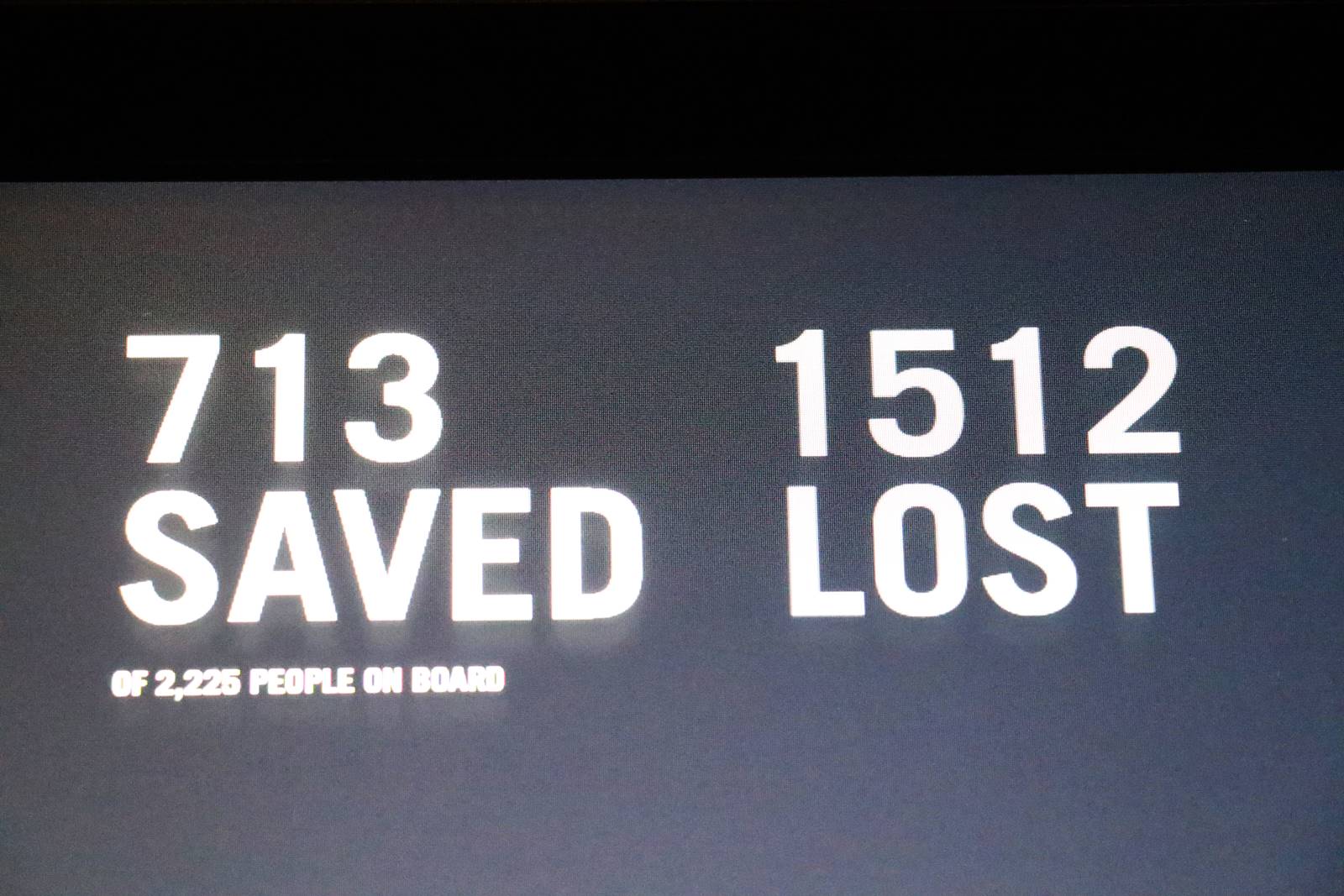 Le Titanic était équipé pour transporter jusqu’à 3547 passagers et hommes d’équipage. La capacité totale des canots de sauvetage était de 1178 personnes. Lors du voyage inaugural 2225 personnes étaient à bord du Titanic. Le nombre total des survivants s’élève à 713. On déplore la mort de 1512 personnes.