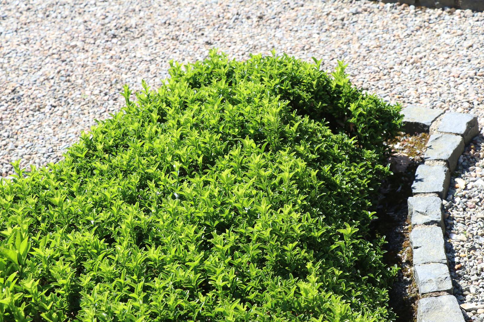 Le fusain, Euonymus fortunei, est un arbuste très rustique au feuillage persistant vert foncé ou marginé de jaune ou de blanc selon les variétés. Certains comme l’Euonymus fortunei var. radicans développent un port rampant et compact qui convient très bien pour former une bordure taillée. Idem pour les variétés Euonymus ‘Sunspot’ au feuillage marginé de jaune et Euonymus fortunei ‘Variegatus’ au feuillage marginé de blanc.