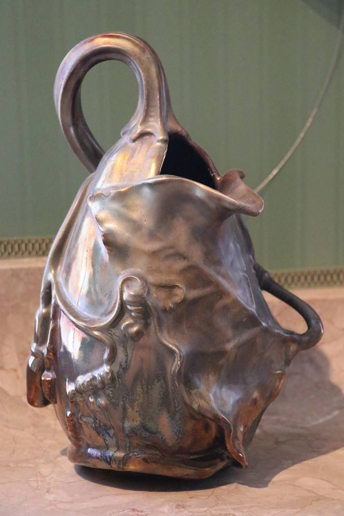 La région Lorraine est réputée pour ses manufactures de céramique. Louis Majorelle collabore avec plusieurs d’entre elles et produit de nombreux objets décoratifs. Ce petit broc en forme de coloquinte produit vers1895 est un exemple de ses collaborations avec la Manufacture Keller et Guérin de Lunéville. L’objet à forte empreinte naturaliste est traité comme une oeuvre d’art. La faïence fine à décor de petit feu présente sur sa face externe un effet métallescent gris, vert et mauve.