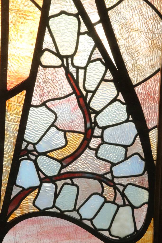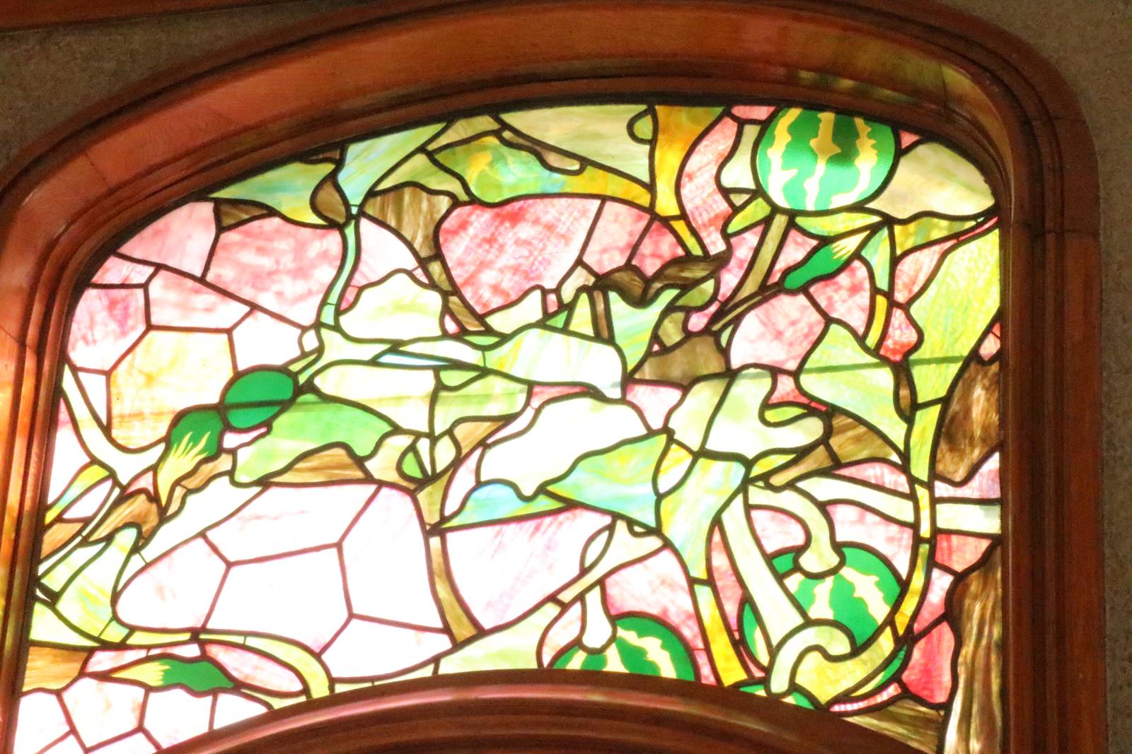 La cage d’escalier est baignée de lumière par un grand vitrail à décor de monnaie-du-pape créé par Jacques Gruber en 1902. Le maître verrier associe la structure de la baie à sa composition. La forme ovale du vitrail et ses montants en métal suivent les mouvements des branches de la plante.