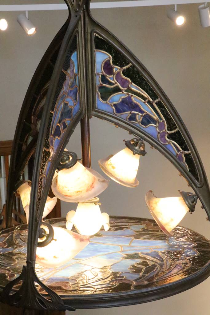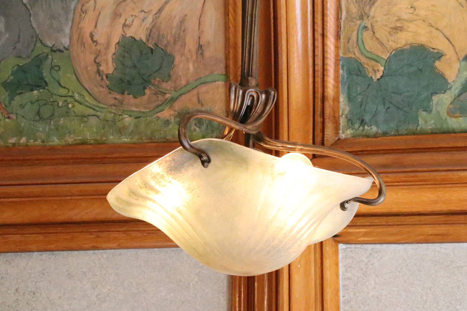 Ce lustre remplace le lustre à décor de monnaie-du-pape choisi par Louis Majorelle pour sa cage d’escalier. Ce lustre est le fruit d’une même collaboration artistique qui fait toute l’originalité des créations de l’Ecole de Nancy. La structure en bronze est forgée par les ateliers de ferronnerie de Louis Majorelle. Les vitraux sont dessinés par Jacques Gruber et les globes en verre soufflés sont réalisés par la manufacture Daum.