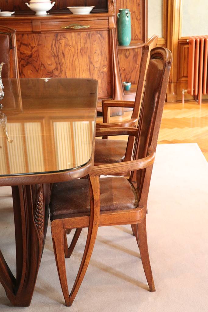 Conçu par Louis Majorelle, le mobilier de la salle à manger est reproduit dans le catalogue de la Maison Majorelle sous le titre «Les blés, modèle riche». Il rassemble un buffet à deux corps, deux dessertes, une table et six fauteuils en chêne avec un placage de bois de serpent, essence exotique originaire d’Amérique du Sud.