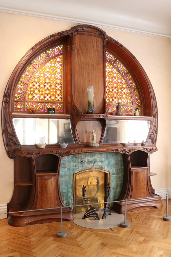 Le salon de la Villa Majorelle est décliné sur le thème de la pomme de pin que l’on retrouve sur le meuble-desserte et la cheminée orné d’un vitrail d’inspiration mauresque. Ce vitrail remplace un vitrail au décor bucolique imaginé par Jacques Gruber qui a disparu suite aux bombardements de la ville en 1916.