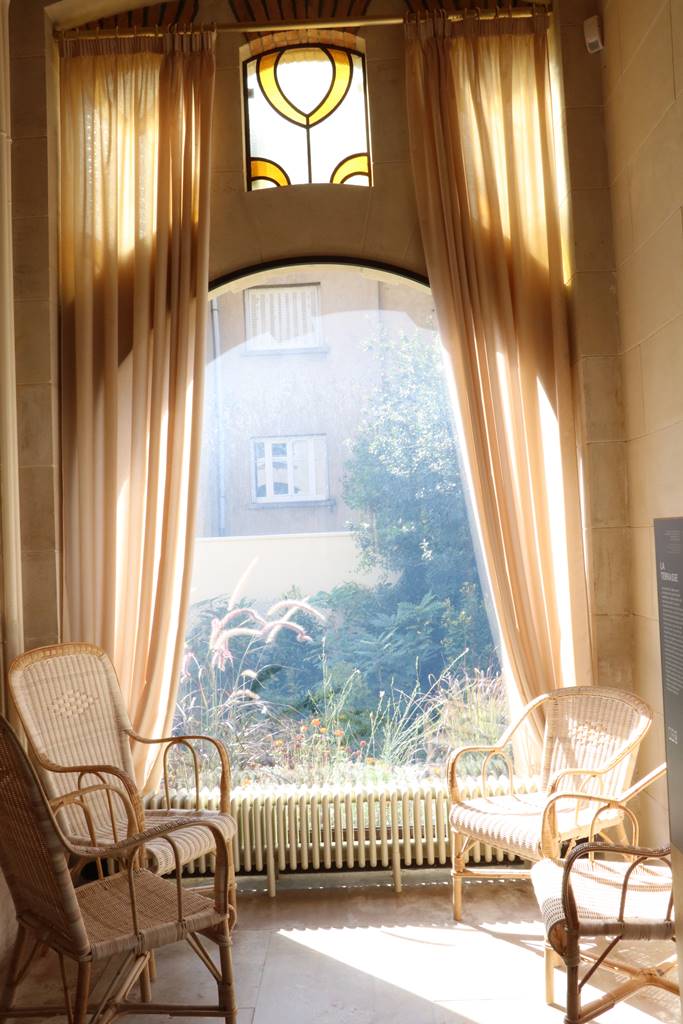 La cheminée partage la pièce en deux parties, la salle à manger et le fumoir éclairé de vitraux de Jacques Gruber.