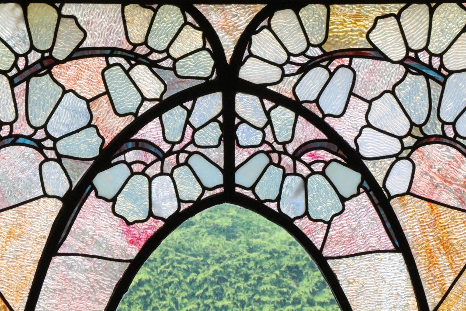La cage d’escalier est baignée de lumière par un grand vitrail à décor de monnaie-du-pape créé par Jacques Gruber en 1902. Le maître verrier associe la structure de la baie à sa composition. La forme ovale du vitrail et ses montants en métal suivent les mouvements des branches de la plante.