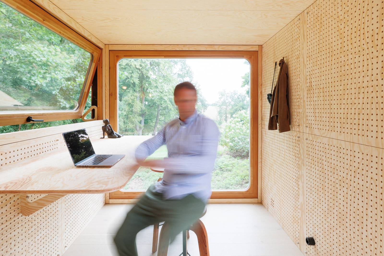 Les panneaux intérieurs sont perforés ce qui donne une acoustique performante tout en permettant la fixation de mobilier en bois de manière flexible. Un bureau peut ainsi devenir une banquette en quelques minutes. Le Woodcab peut être équipé d’un système de radiateurs intégrés ou d’une pompe à chaleur. Le module peut aussi bien s’installer sur un terrain en location que sur une propriété privée. Entièrement démontable, il déménage sans laisser aucune trace.